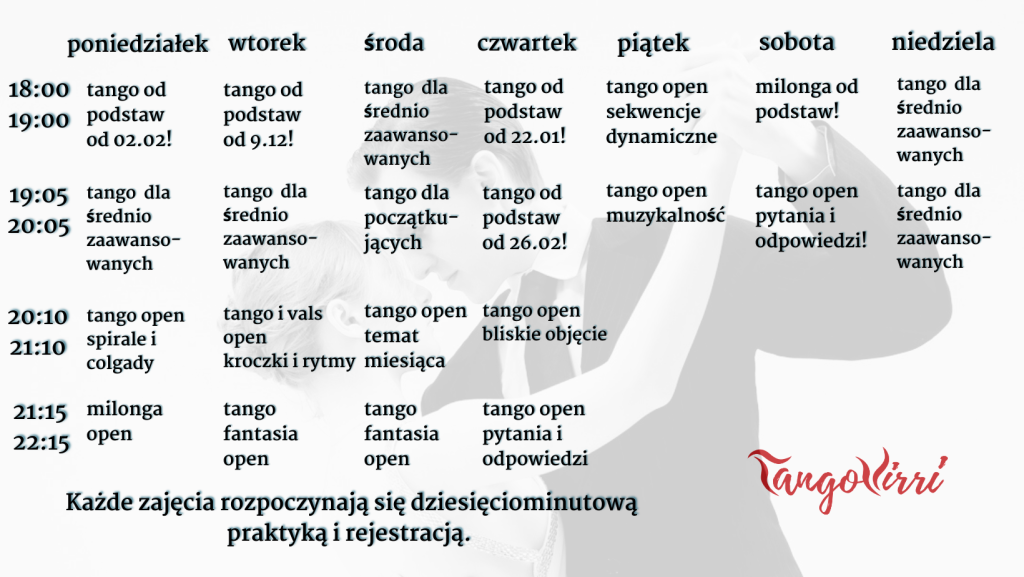 - open – 230 zł – wszystkie zajęcia, praktyki i milongi przez 4 tygodnie.